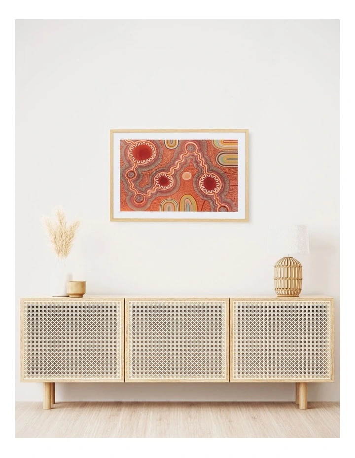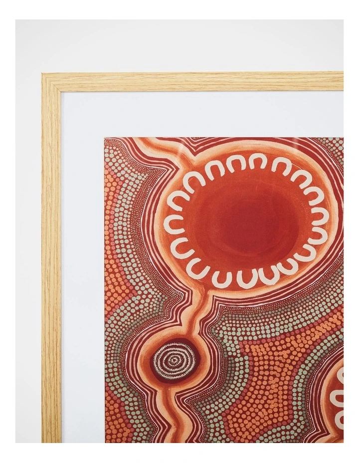 Emma Stenhouses SS23 collection, titled Journey & Nurture, is based on her personal journeys and connections as an Indigenous woman. Emmas story spans across four decades, desert and sea; as she explores the challenges and monuments of her cultural growth, connection to Country and being an Artist. Moving through time and space, from the bush to the beach her stories are formed by her deep relationship to land and guided by strong female role models in her community: Dry Creek is placed outside of Broken Hill in Outback NSW in Mutawintji National Park. A place of red dirt, dry land and gorges where waterholes remain after much needed rain. The dry creek bed winds its way through the gorge and dust is firmly settled on the rocks. The hot sun blazes down during the summer; the heat will eventually dry up these waterholes. The cave paintings tell stories of those who survived on this land and remind us if we care for Country, even in the dry, she will care for us.
