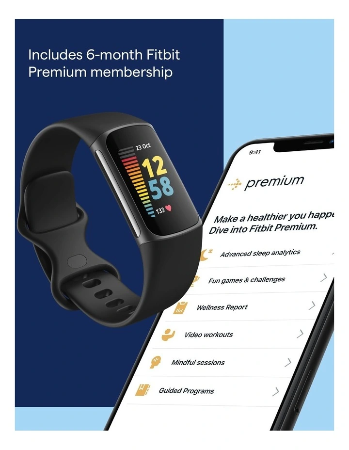 Fitbit Charge 5 Premium connects the dots between your activity, sleep and stress so you can make the best decisions for your body, mind and health. It all starts with your 6-month Premium membership* and Daily Readiness*, a score based on activity, sleep and heart rate variability (HRV) that helps you optimise your workout routine.