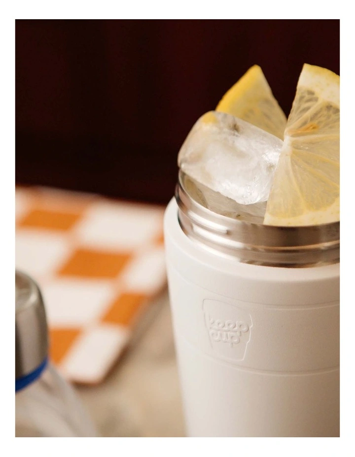 Made from 18/8 stainless steel – a vacuum insulated cup and clear plastic bottle lid. KeepCup Bottle unscrews in the middle to fill with fruit, ice, boba and everything in between.