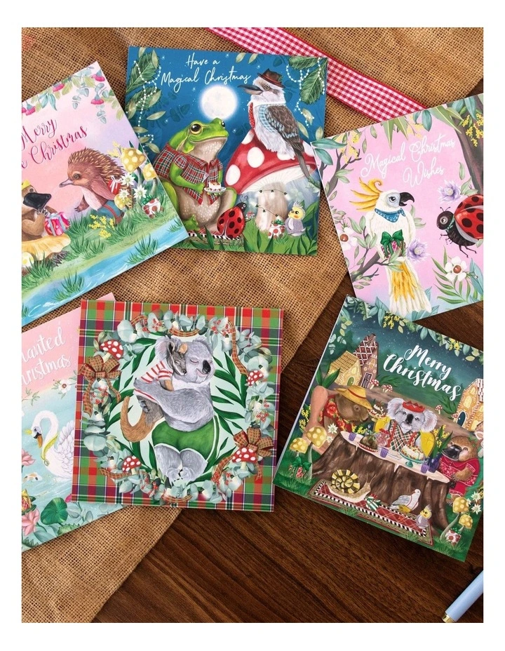Set of 6 individual illustrated Christmas Cards showcasing an Australian-themed Christmas featuring our beloved native critters, illustrated by Murilo Manzini. Comes boxed with 6 envelopes. Inside card is blank.