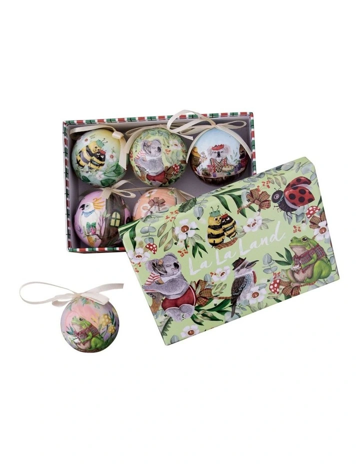 Set of 6 individual small illustrated baubles showcasing an Australian-themed Christmas featuring our beloved native critters, illustrated by Murilo Manzini. Comes in a decorated solid gift box, perfect for storing away with your decorations at the end of the season.