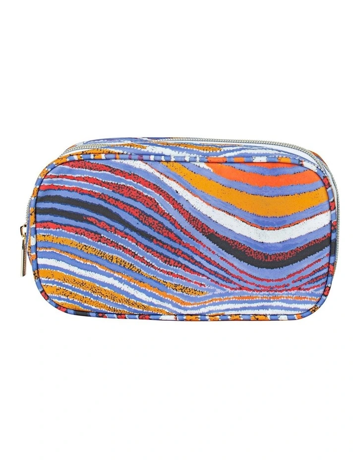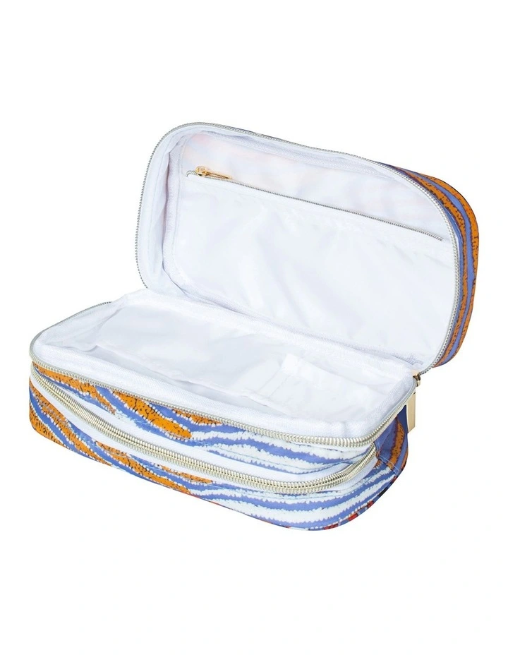 This double compartment beauty bag features gold zipped closures. The large pocket opens flat for ease of access and features a side inner pocket, three individual pockets for makeup brushes and smaller beauty essentials and an additional gold zipped pocket. The second compartment opens to a roomy main pocket, which features four additional inner pockets. The outer is made from a water resistant fabrication and the inner is made from a recycled polyester RPET.