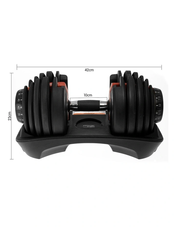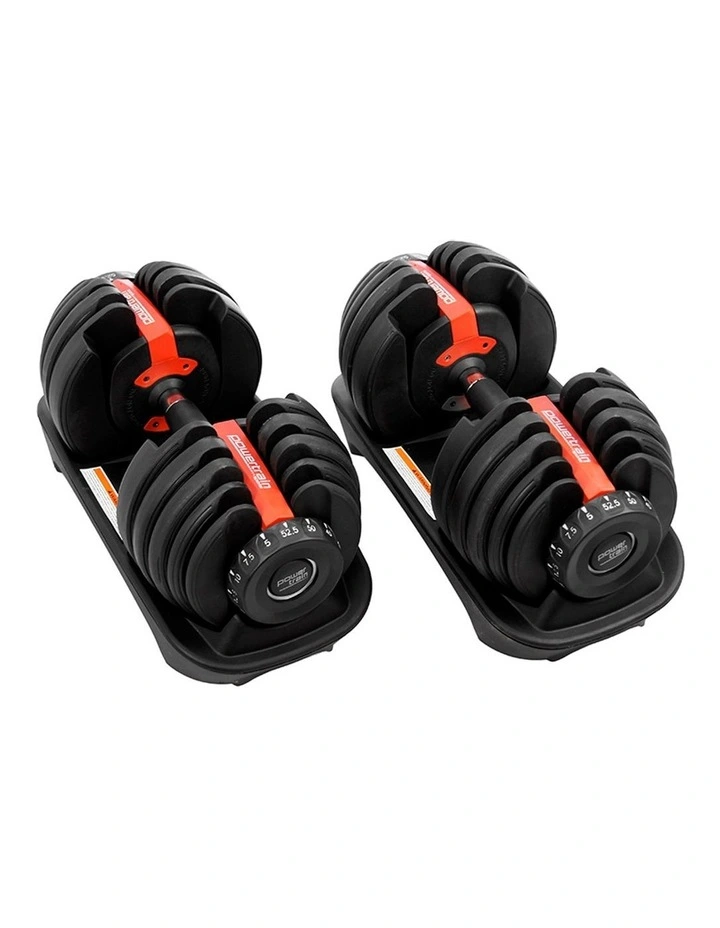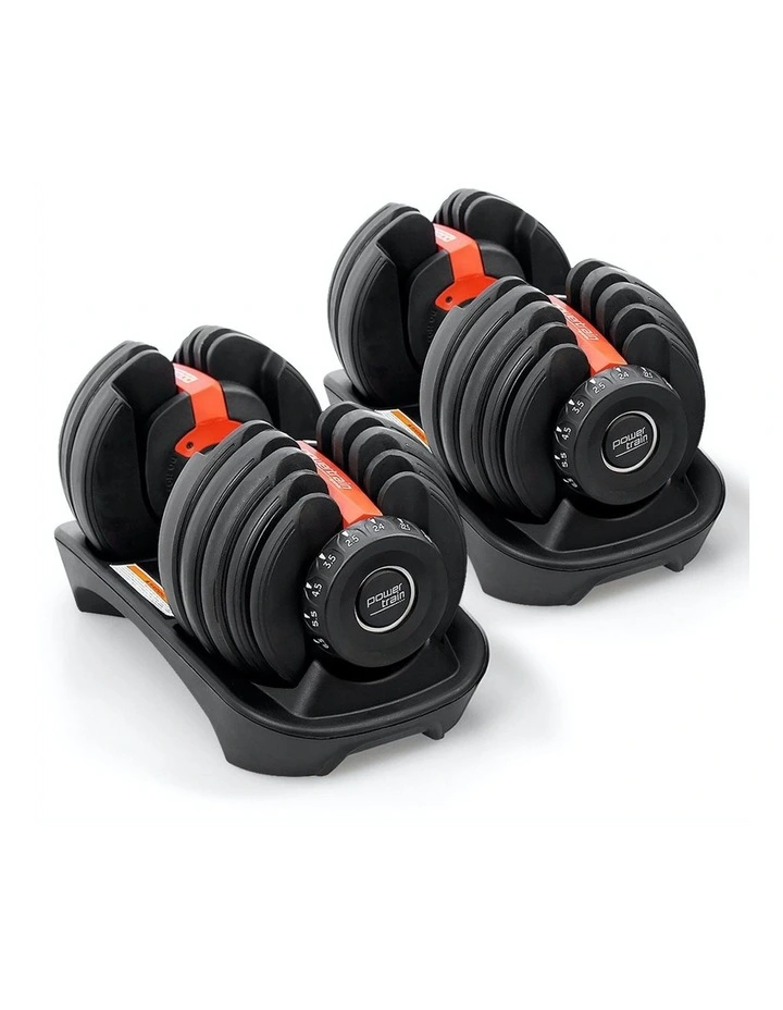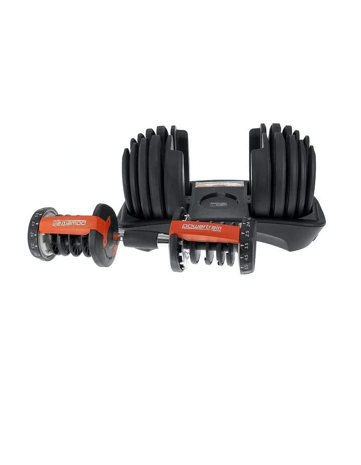 The PowerTrain Adjustable Dumbbell set’s ergonomic design makes it the most space-efficient and flexible strength-training option available. With just the turn of a dial, you can automatically change your resistance on each dumbbell from 5 pounds all the way up to 52.5 pounds of weight on each side.It adjusts in 2.5-pound increments up to 25 pounds and then in 5 pound increments, enabling you to gradually increase your strength while training with the perfect weight to push your limits.